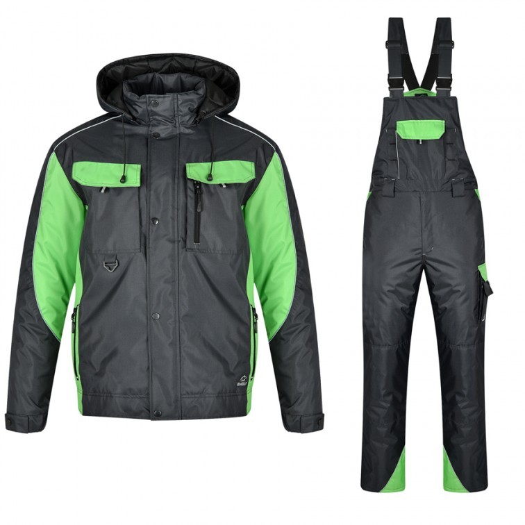 Зимен, студо и ветрозащитен ватиран комплект яке с полугащеризон изработени от 100% ПЕ оксфорд, 300D 160гр/м2. Вата яке 150гр/м², вата гащеризон 120гр/м² . Якето е с висока права яка. Закопчаване с цип покрит с пластрон с тик-так копчета. Топла, сваляща се качулка с цип и ластичен шнур със стопери за пристягане. Светлоотразителен паспел по контура на платки и ръкав. Горни джобове с мех, ляв горен джоб с цип и долни вътрешни джобове. Джоб на подплатата, закопчаващ се с велкро. Джоб за химикали на ляв ръкав. Халка за закачане на идентификационни карти. Маншет с ластик на ръкава. Полугащеризонът е с регулируем ластик в талията и висок гръб. Джоб на предна платка с плохи и разделения за химикал и инструмрнти. Затваря се с капак и велкро. Предни долни вътрешни джобове. Задни джобове с мех и капаци. Мултифункционални обемни странични и инструментални джобове. Регулируеми презрамки с ластик към гърба. Широки гайки на колана. Долната част на крачола е под форма със светлоотразителен паспел.