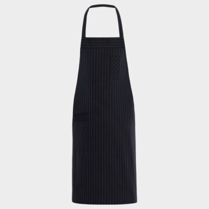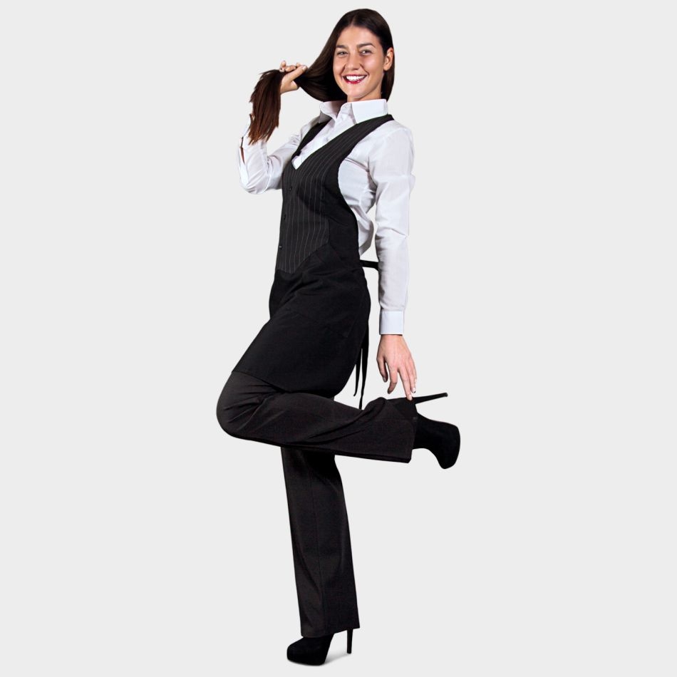 Престилката е изработена от шикозно райе, което придава изтънченост и визуален интерес. Нагръдникът осигурява допълнително покритие и защита, като същевременно допринася за цялостната естетика на модела. Предната част е оформена така, че имитира елек – детайл, който добавя нотка официалност и прави престилката подходяща за различни професионални среди, включително ресторанти, кафенета, салони и бутици.