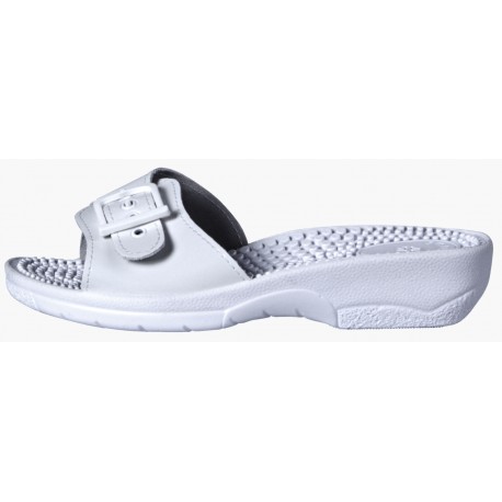 Дамските чехли са отворен тип изработени от TNT синтетична кожа. Ходилото е изработено от ПВЦ, както и стелката, която е под формата на топчици за да Ви масажира стъпалото докато сте в движение. Горната част на чехлите е с катарама, което позволява регулация спрямо ширината на крака ви. Тези комфортни чехли са подходящи както за работа, така и за свободното време.