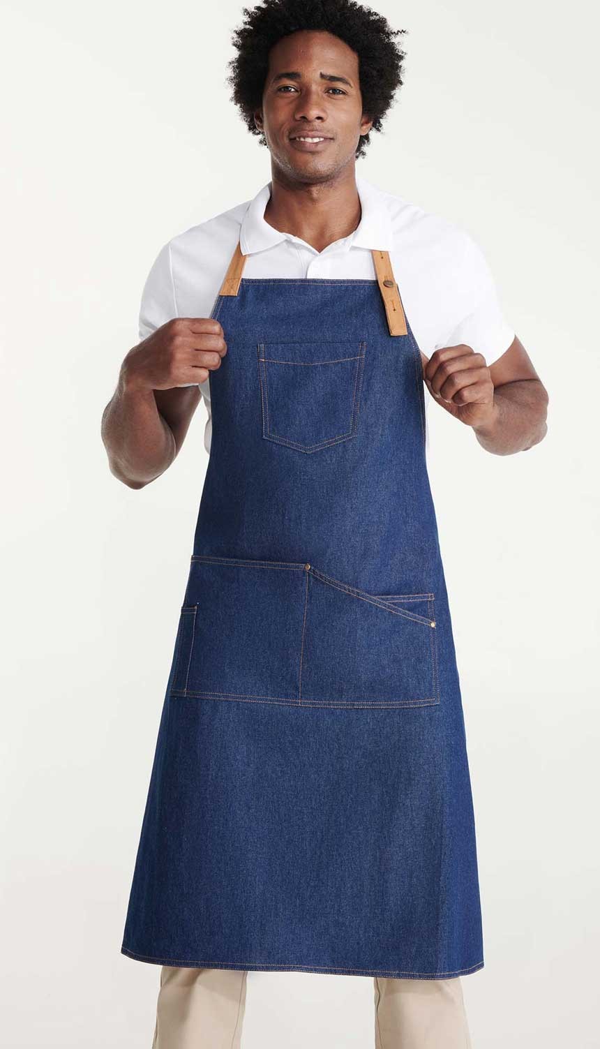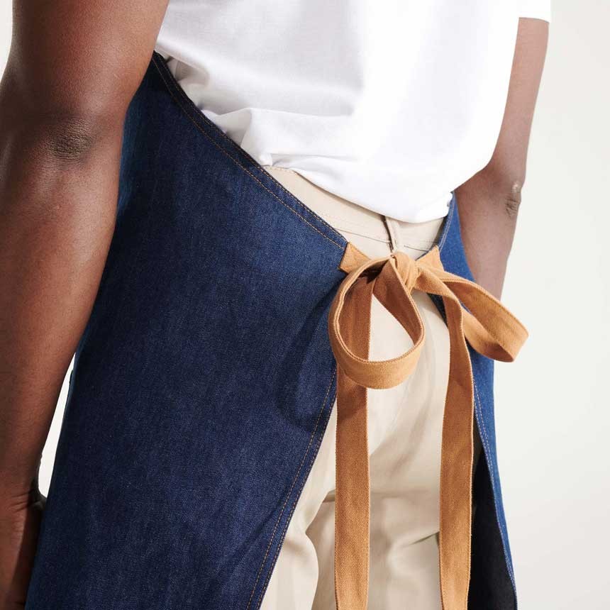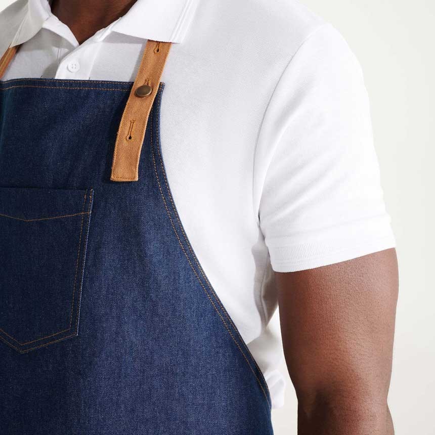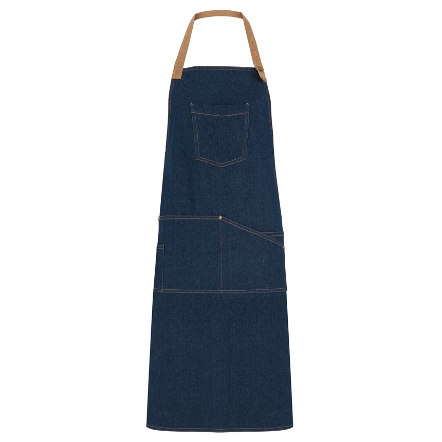 Дълга унисекс дънкова престилка с контрастен регулатор на врата с метално копче. Престилака има голям преден джоб на гърдите и четри на кръста.