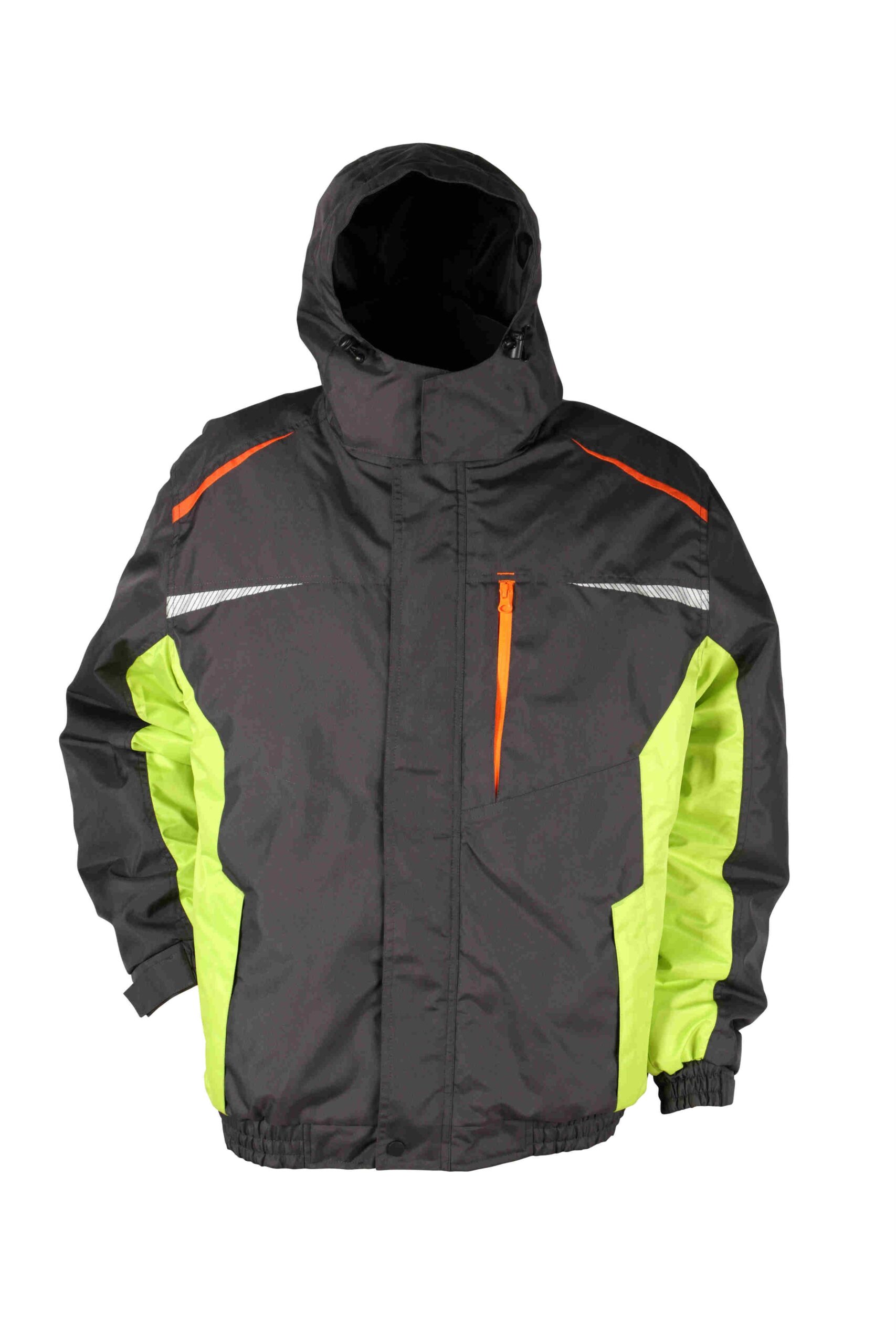 Работно яке PRISMA WINTER сиво/зелено е ватирано и има качулка. Якето е ветро и водоустойчиво с подплата. Зимното яке се закопчава отпред с цип който е покрит с платка. Якето има два долни джоба и един на гърдите който се закопчава с цип. Отпред на гърдите и отзад на гърба якето има пришити светлоотразителни елементи. За по-голямо удобство в долната част на якето и ръкавите е поставен ластик. Много топло и удобно яке, отлично за студените зимни дни.