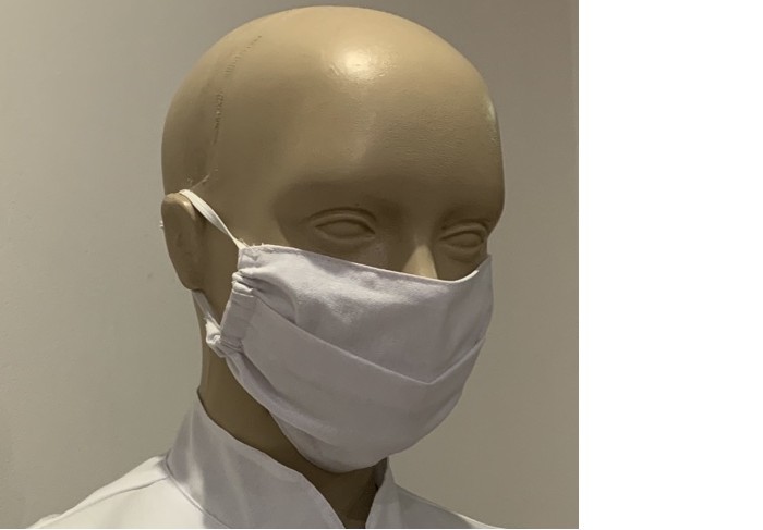 Санитарна маска от плат изработена от бял плат. Маската се захваща с ластици за ушите, може да се пере, глади и дезинфекцира. Маската трябва да се носи не повече от два часа след което трябва да се изпере и/или дезинфекцира.