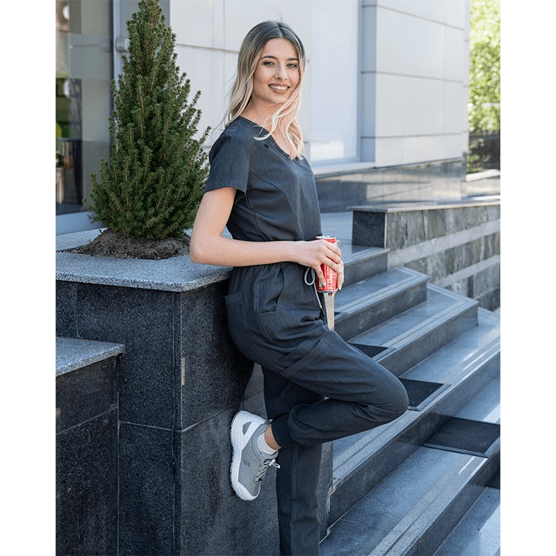 Медицински панталон RICCI е изработен от лека материя, комбинация от полиестер, вискоза и еластан. Панталона е с широк ластик в талията с връзки за пристягане. Два предни джоба, два задни и три странични, единият от които е с цип. Крачолите са с ластик. Подходящи за работа в медицински и болнични заведения, детски градини и ясли, както и за кухненски персонал