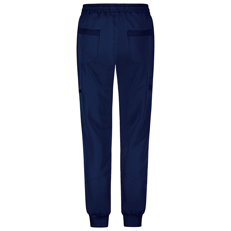 Медицински панталон RICCI е изработен от лека материя, комбинация от полиестер, вискоза и еластан. Панталона е с широк ластик в талията с връзки за пристягане. Два предни джоба, два задни и три странични, единият от които е с цип. Крачолите са с ластик. Подходящи за работа в медицински и болнични заведения, детски градини и ясли, както и за кухненски персонал