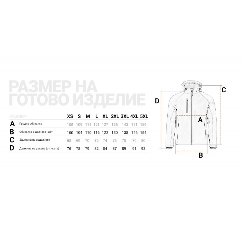- Материя: 150D полиестер механично стречиран + TPU мембрана + полар, 300 гр./м², 8000 мм воден стълб, 200 mvp въздухопропускливост.