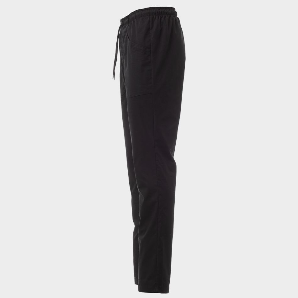 Дизайнът на панталона е съобразен с нуждите на професионалната кухня. Еластичният колан с връзки гарантира сигурно и удобно прилягане, като позволява индивидуално регулиране според предпочитанията на носещия. Практичността е допълнена от два предни джоба, джоб за монети и заден джоб с нашивка, които осигуряват лесен достъп до най-необходимите вещи. Малкият джоб за принадлежности е идеален за съхранение на инструменти или аксесоари, които трябва да са винаги под ръка.