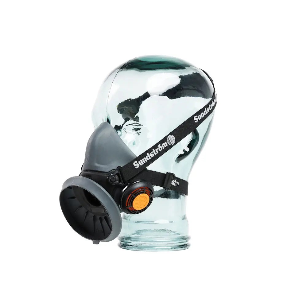 Маска за дихателна защита Sunstrom SR 900 с филтър P3 SR510, който предпазва от фини прахови частици, спори, вируси, бактерии, течни и твърди аерозоли и димни газове. Маска SR 900 е изработена от термопластичен полиуретан (TPE) в комбинация с полипропилен (PP). Маската е оборудвана с два клапана за издишване, което осигурява много лесно издишване. Капачките на клапаните са със защитни прегради които предпазват мембраните от прах и мъгла от боя. Материалът и пигментът на тялото на маската са одобрени от FDA за храни, което минимизира риска от контактни алергии. Лесно регулируемите ластични колани за глава на маската са проектирани като V-образна примка и имат голяма изпъкнала корона, която допринася за удобно и безопасно прилягане. Полумаската SR 900 се използва в комбинация с филтри от гамата Sundström.В комплекта са включени предфилтри SR 221 5 бр с капачка-държач за тях и кърпичка за почистване.