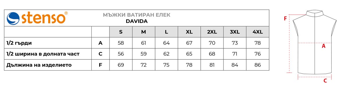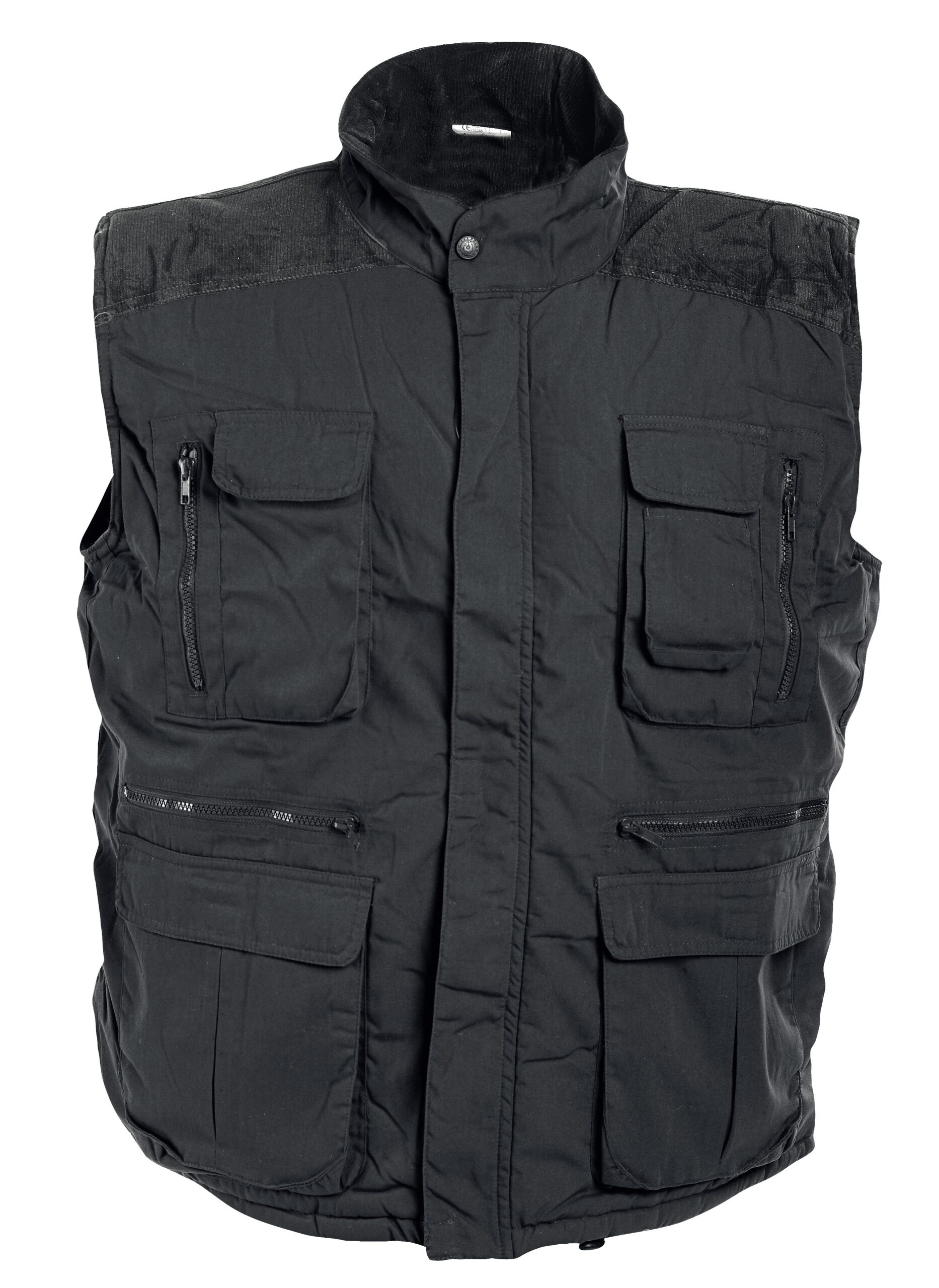 Ватиран елек в черен цвят от плат памук и полиестер. Защитава тялото от ниска температура на въздуха, вятър, влага, пръски вода и нетоксични замърсявания. Елека е студозащитен с подплата с яка тип столче. Закопчаване е с цип, покрит с пластрон с тик-так копчета, подсилени рамена. Елека е с много и многофункционални джобове – два горни вмъкнати с цип, два горни с капаци, два долни вмъкнати с цип, а под тях два с капаци, два странични и два вътрешни който се закопчават с велкро.