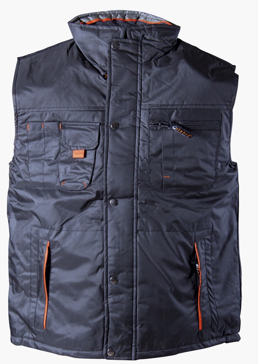 Ватиран елек в черен цвят, изработен от полиестер с промазка, водоотблъскващ. Защитава тялото от ниска температура на въздуха, вятър, влага, пръски вода и нетоксични замърсявания. Елека е студозащитен с яка тип столче. Закопчаване с цип, покрит с пластрон с тик-так копчета, джобове – един горен вмъкнат с цип, един горен с капак и две оределения за химикалки, два долни с цип, два вътрешни – един с цип и един с велкро.
