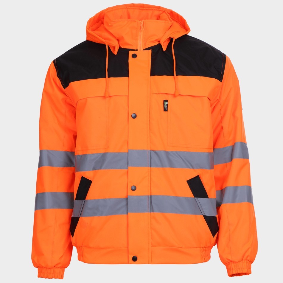 Работен водозащитен ватиран костюм състоящ се от яке с топла качулка и полугащеризон. Якето е със спортна кройка в жълт електриков цвят със светлоотразителни ленти на тялото и на ръкавите . В долната част на якето има ластик, закопчаването е с цип, който е покрит с платка ,която се закопчава с тик-так копчета. Якето има два външни горни джоба с капаци и два долни. Полугащеризона е с презрамки , които се регулират. Работния гащеризон се затваря централно с цип, а в долната част на крачолите има два броя светлоотраителни ленти. Комплекта е светлоотразителен и отговаря на EN 13688-2013. Много удобен и топъл работен комплект.