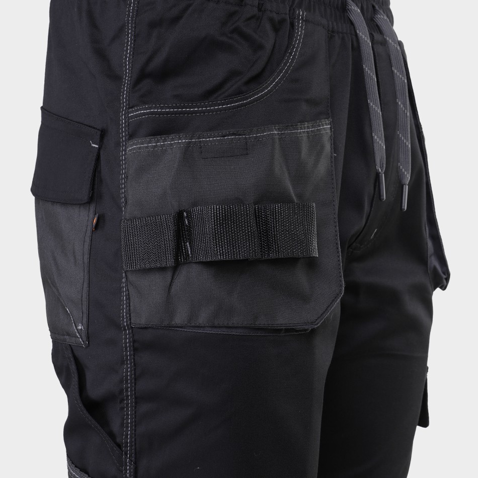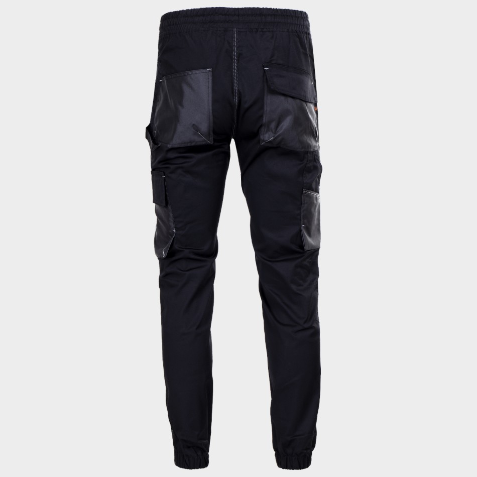 Функционален работен панталон със спортна визия, еластична талия с връзки за пристягане и еластични крачоли. Халка за чук, мултифункционални джобове и сигнални елементи. Материя: 32% памук, 65% полиестер, 3% спандекс, 240 гр./м² Модел: REVOLT SPORT Панталон, черен Размери: S-4XL |