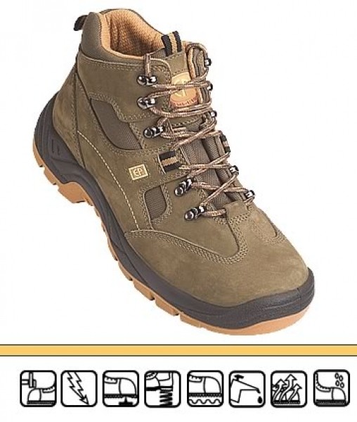 Обувки цели от водонепропусклив телешки набук и полиамидна тъкан, маслоустойчиво, антистатично ходило с двойна плътност /устойчиво до 180оС/, антиалергични, с противоизпотяваща стелка Tybrelle, метално бомбе от COMPOSITE, противопробождаща стоманена вложка в ходилото от COMPOSITE Wellmax. EN ISO 20345