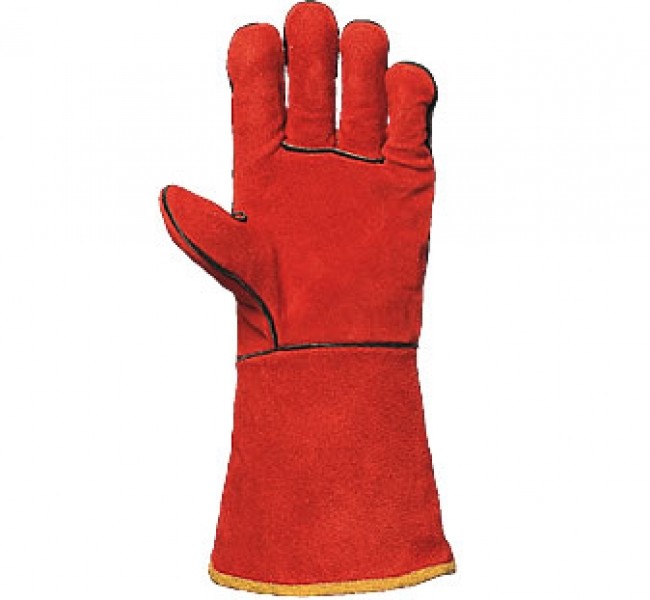 Работни ръкавици за заварчици от цепена телешка кожа, пет пръста, маншет 15 см, с подплата, топлоизолационни: 100 оC – 30 сек, 250 оC – 10 сек. Пригодени за заваръчни и топлинни дейности в индустриални условия. EN 388, 407, 420