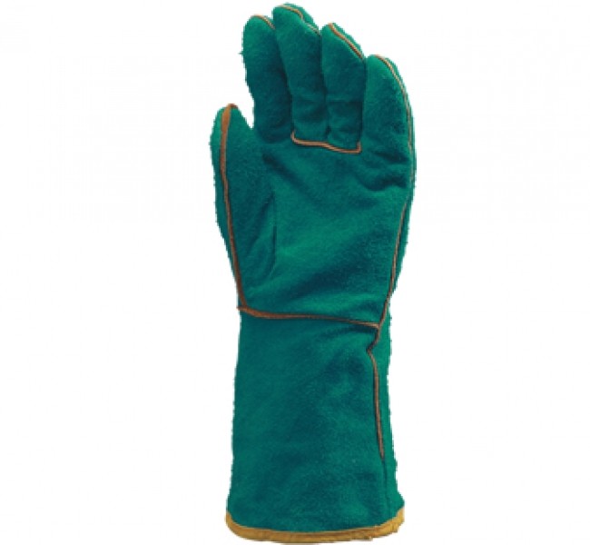 Работни ръкавици за заварчици от цепена телешка кожа, пет пръста, маншет 15 см, с подплата, топлоизолационни: 100 оC – 30 сек, 250 оC – 10 сек. Стандартна изработка, пригодени за заваръчни и топлинни дейности в индустриални условия. EN 388, 407, 420
