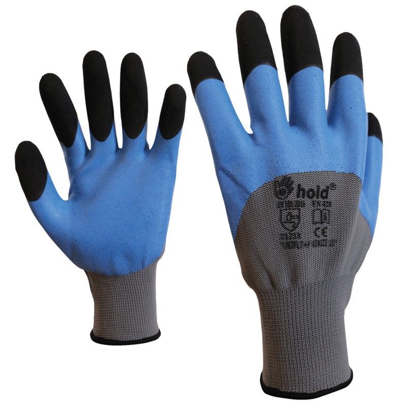 Ръкавиците са с пет пръста от плетено, безшевно, полистерно трико 13G, двойно топени в латекс. В областта на китката са с ластичен маншет. Удобни и здрави ръкавици за работа.
