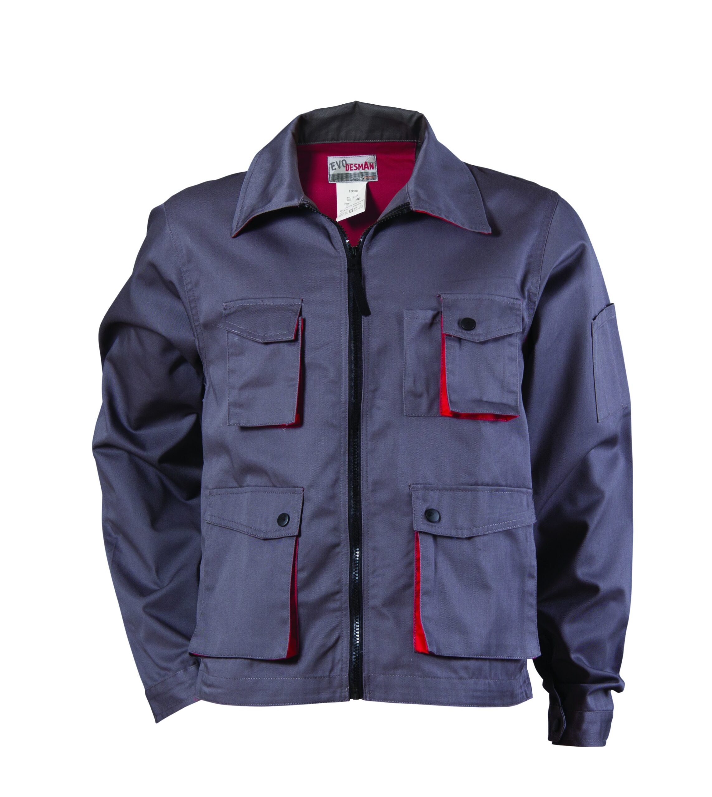 Яке EVO- DESMAN е изработено от памук / полиестер , 235 g/m2 . Якето защитава от производствени замърсявания и механични въздействия . Якето е със свободна кройка , закопчаване със цип . Джобове – два горни с капаци и две отделения за химикал , два долни с капаци и един на ръкава . В долната част на ръкавите има колан с копче за пристягане по китката.