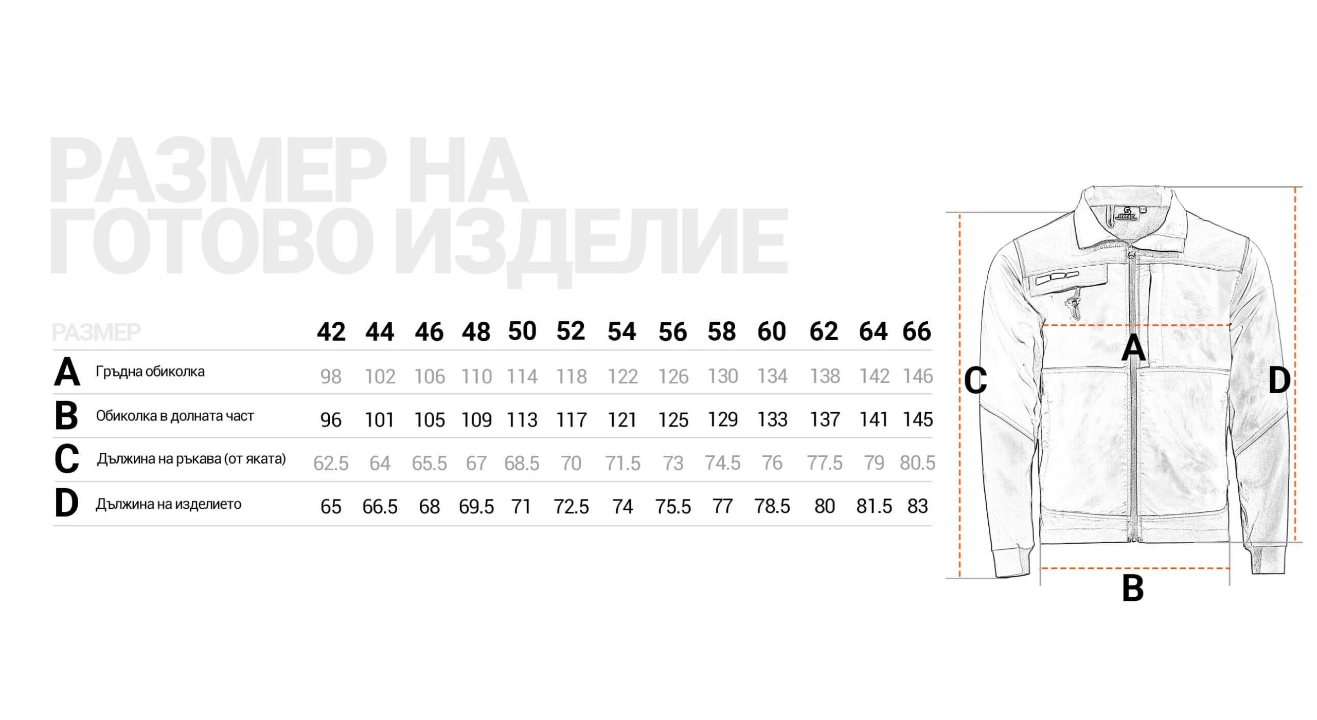 Работното яке е изработено от 65% полиестер, 32% памук, 3% спандекс, 210 г/м². Има два горни джоба, единият е с капак с велкро закопчаване и халка, а другия е вертикален със скрито закопчаване с цип. Има и два долни странични джоба, където закопчаването е с цип.