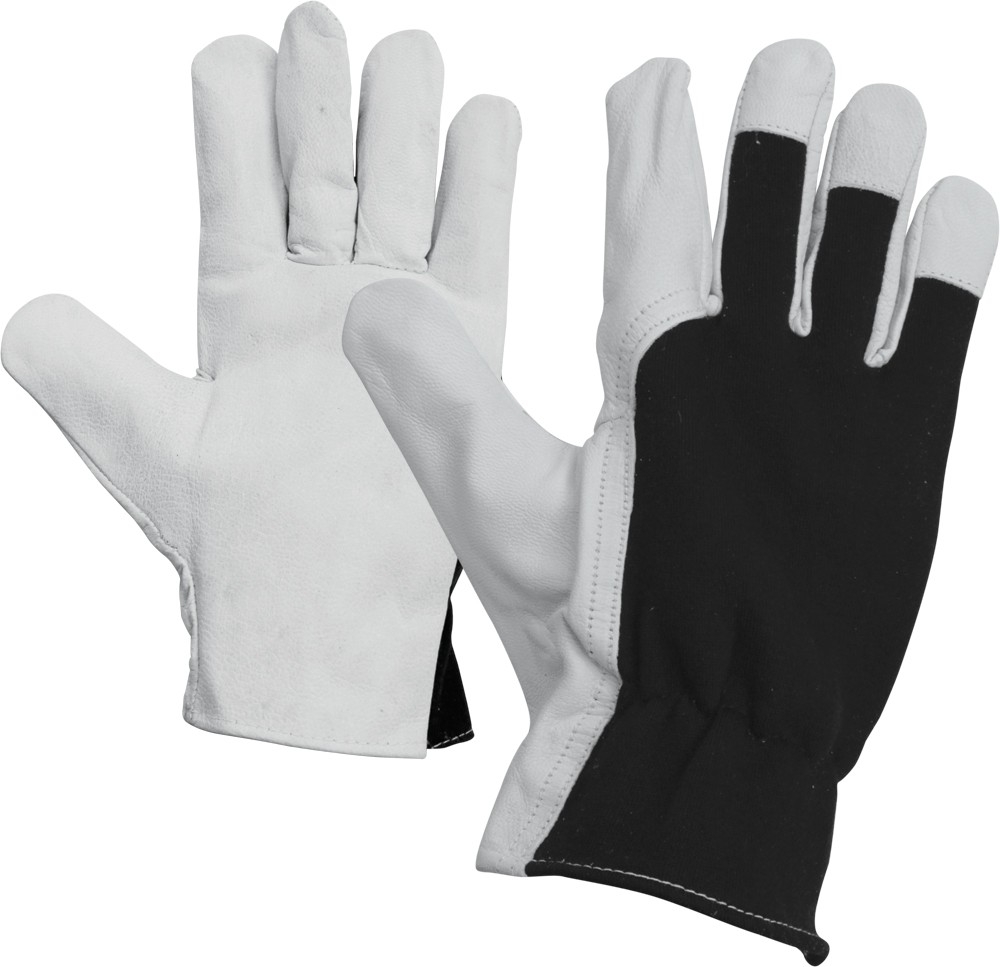 Ръкавици изработени от фина бяла агнешка кожа на дланта, гръб и пръсти изработени от черно памучно трико, набран ластик в областта на китката