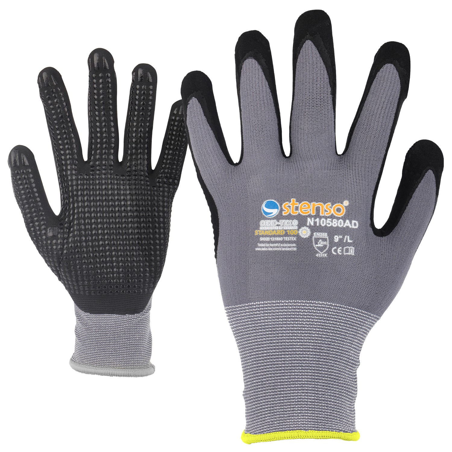 Работни ръкавици от плетен безшевен полиамид с ликра с 15 нишки. Ръкавиците са топени в разпенен микропорест нитрил, с нитрилови капки по дланите и пръстите, перфектна чувствителност, много добра устойчивост на маслена и водна среда.