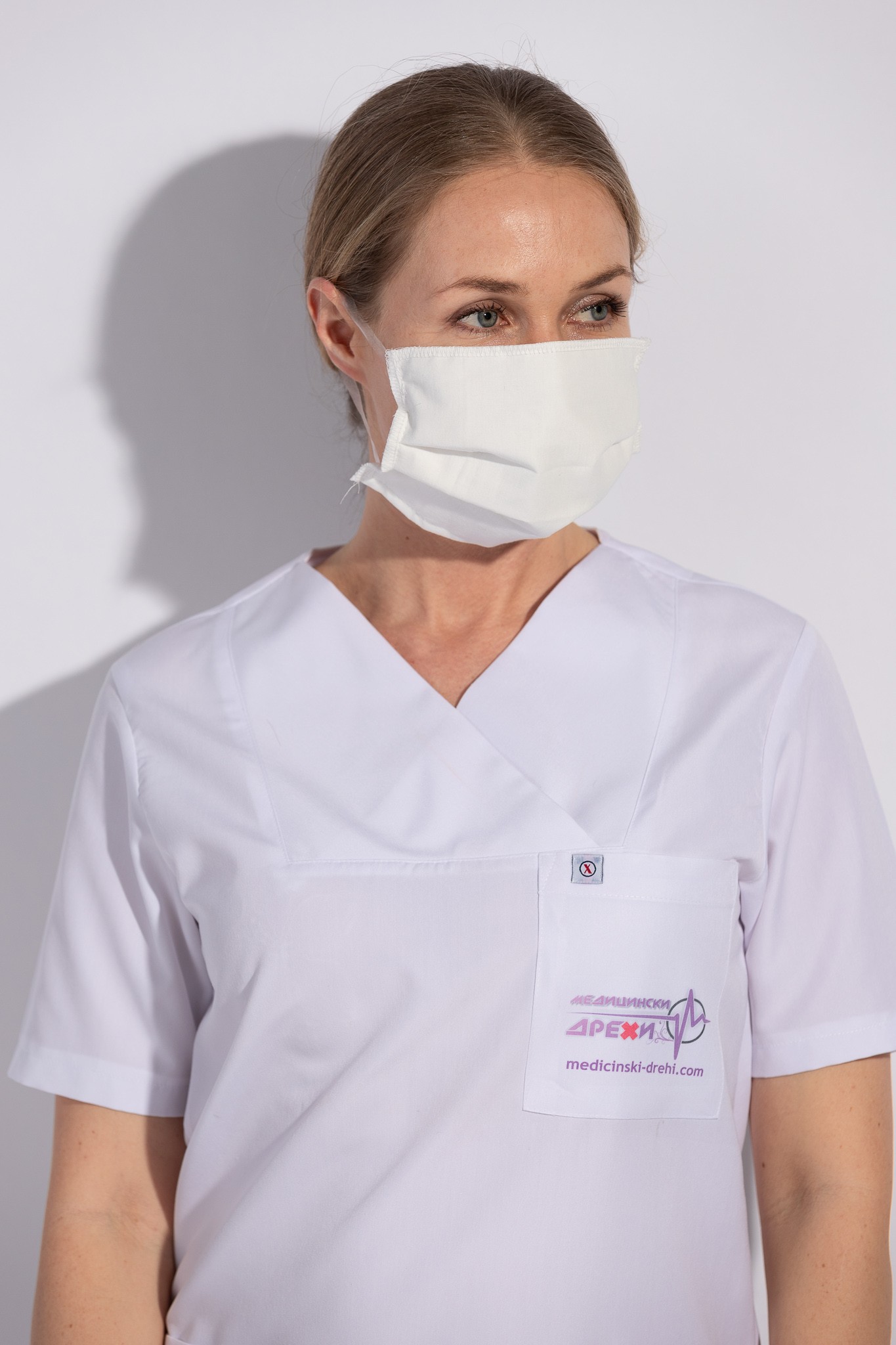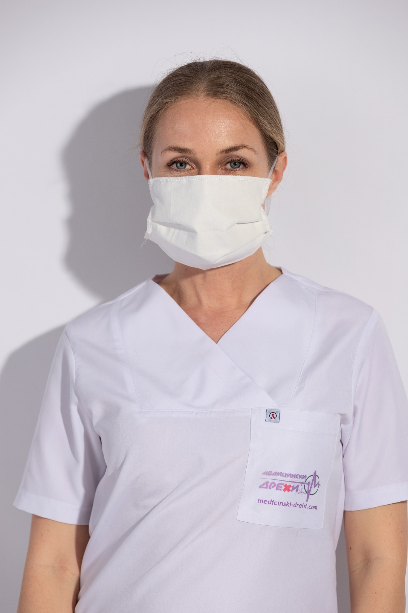 Санитарна маска от плат. Маската е три пластова. ластиците с които се закрепва са различни видове /снимката е илюстративна. Санитарната маска може да се носи два часа след това трябва да се дезинфекцира. Маската може да се пере и глади. За многократна употреба.