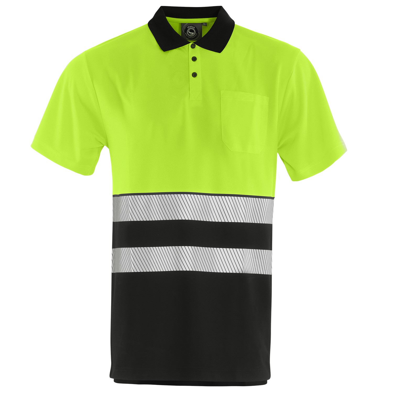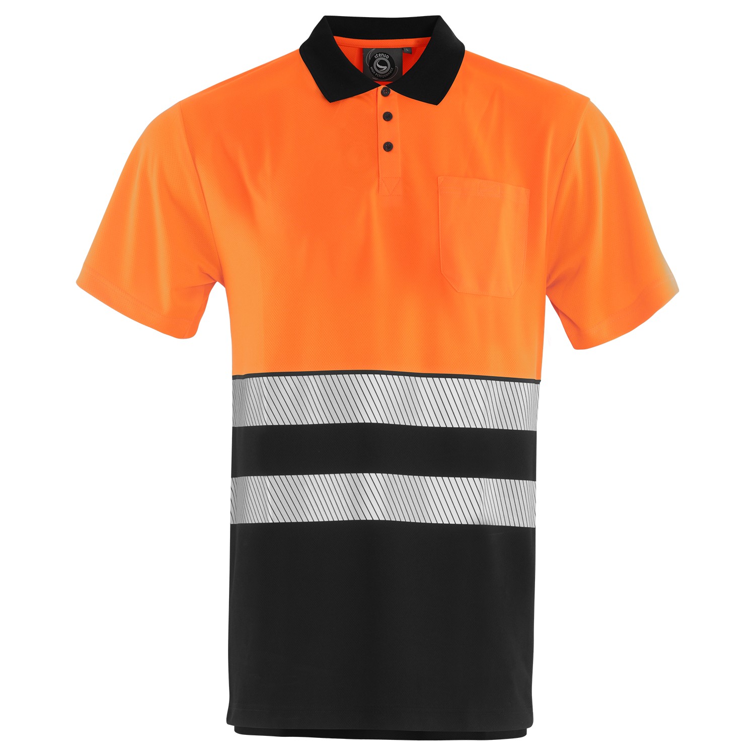 Удобна и лека тениска с якичка със светло отразителни ленти и джобче на гърдите. Тениската е изработена в два цвята черен и оранжев или зелен и черен. Лека и удобна тениска подходяща за всякакви условия.