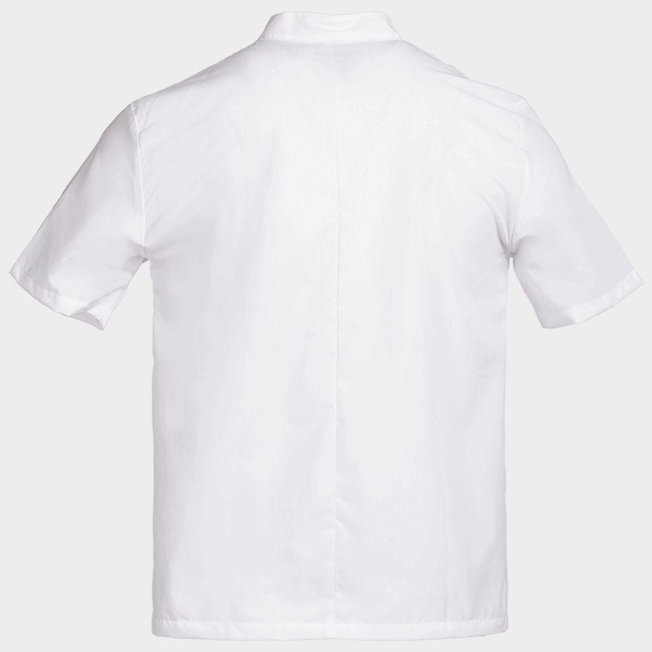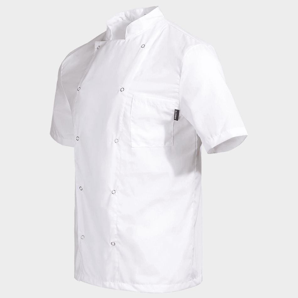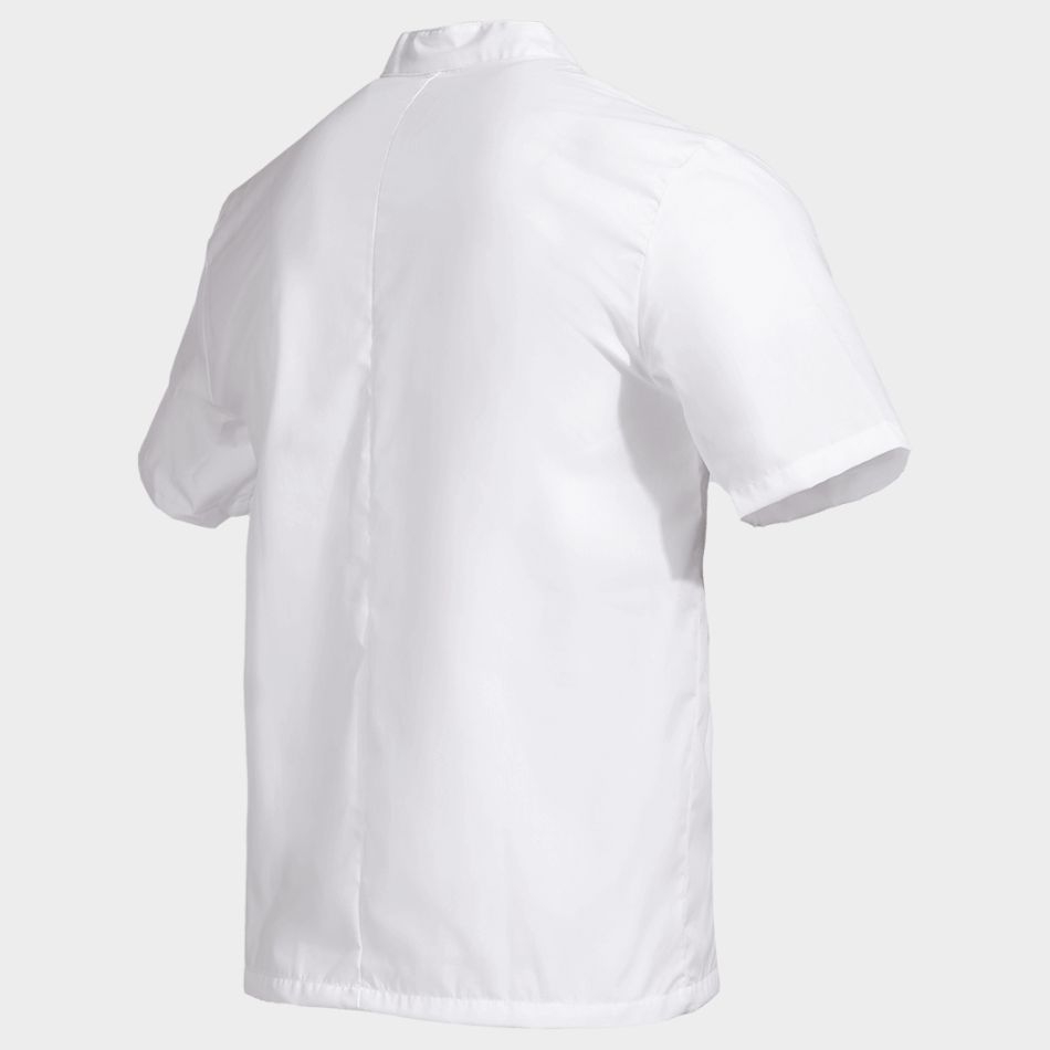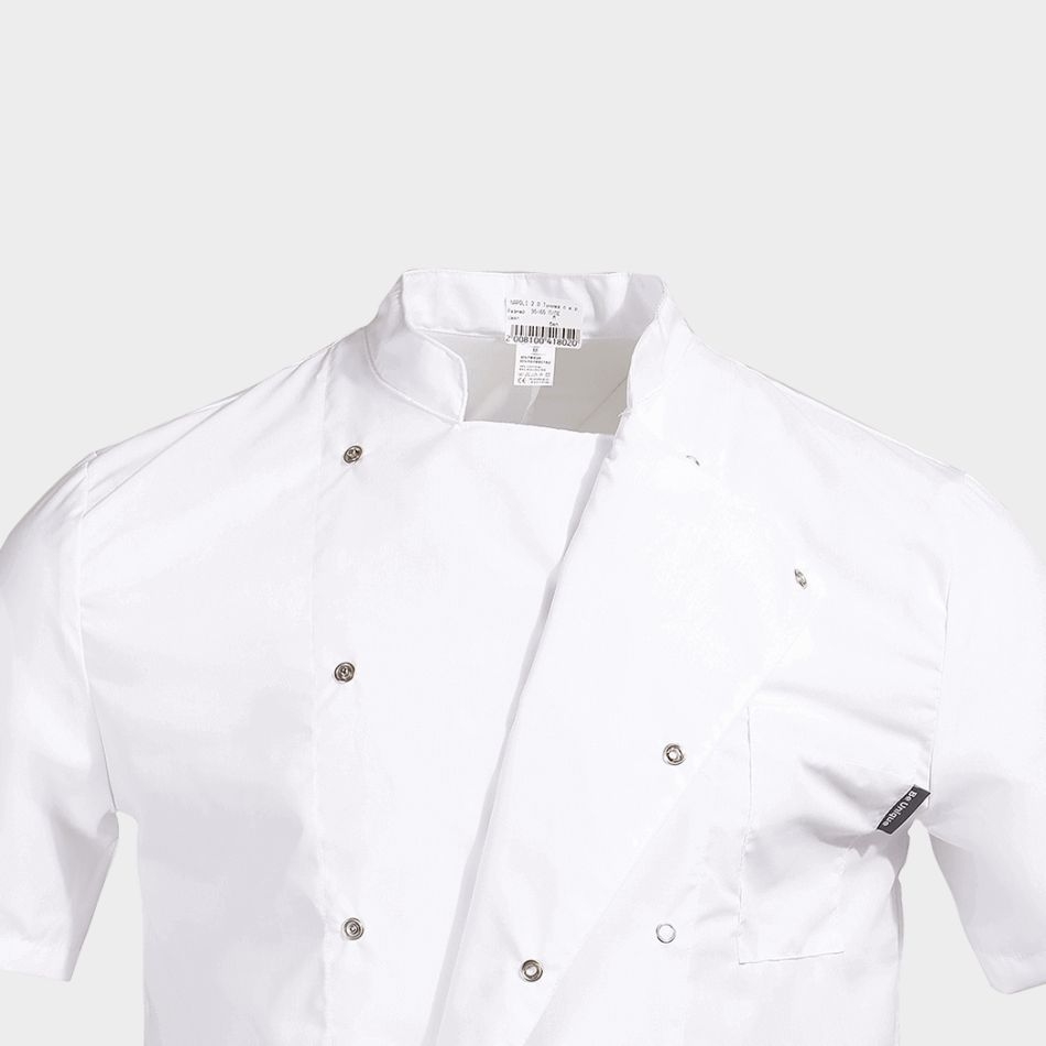Късите ръкави осигуряват допълнителна лекота и свобода на движение, особено в по-топли условия или при работа в гореща кухня. Двуредното закопчаване с тик-так копчета позволява лесно обличане и събличане, като същевременно придава професионален и подреден външен вид. Функционалният джоб на ръкава е практично допълнение, което позволява съхранение на дребни аксесоари, като термометри, химикалки или бележки.