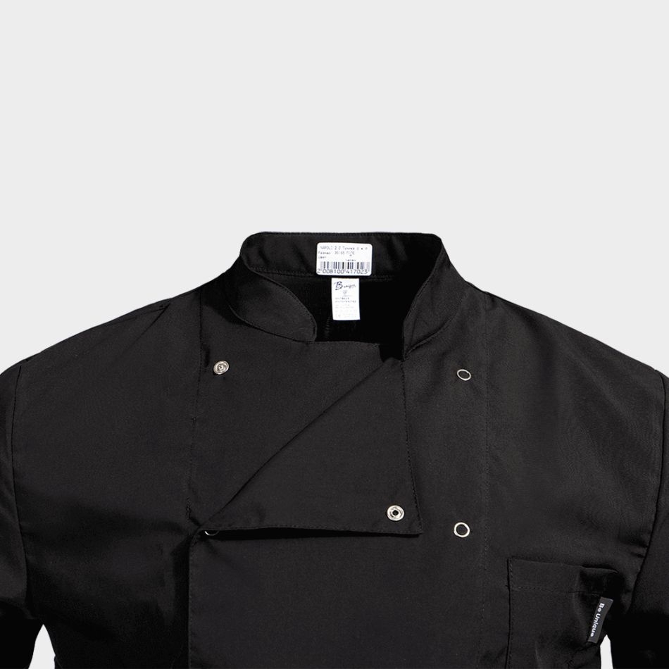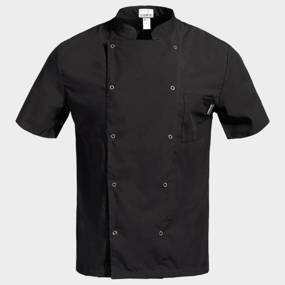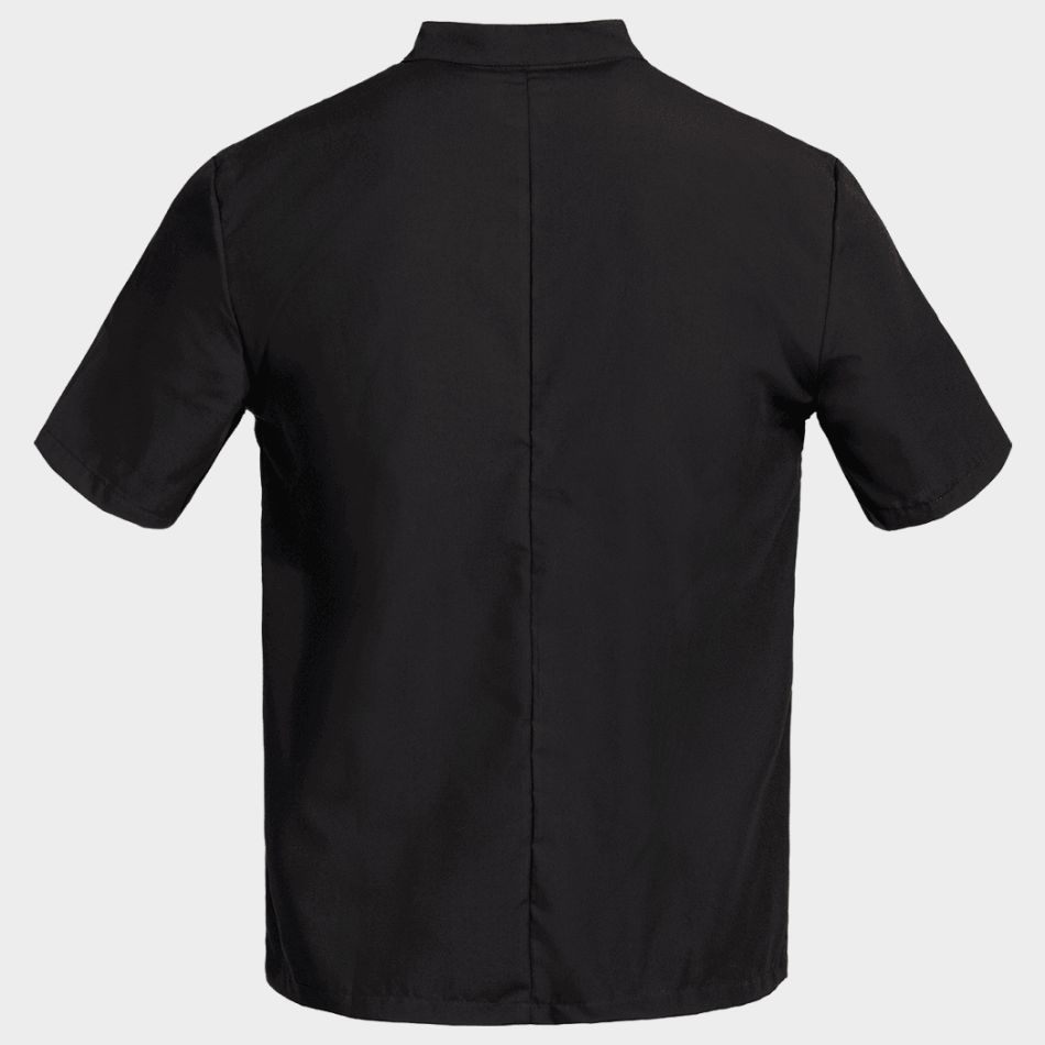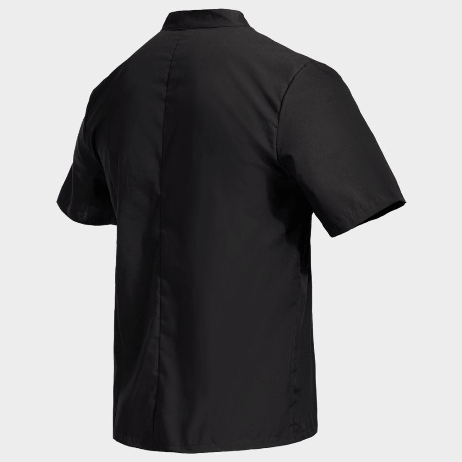 Късите ръкави осигуряват допълнителна лекота и свобода на движение, особено в по-топли условия или при работа в гореща кухня. Двуредното закопчаване с тик-так копчета позволява лесно обличане и събличане, като същевременно придава професионален и подреден външен вид. Функционалният джоб на ръкава е практично допълнение, което позволява съхранение на дребни аксесоари, като термометри, химикалки или бележки.