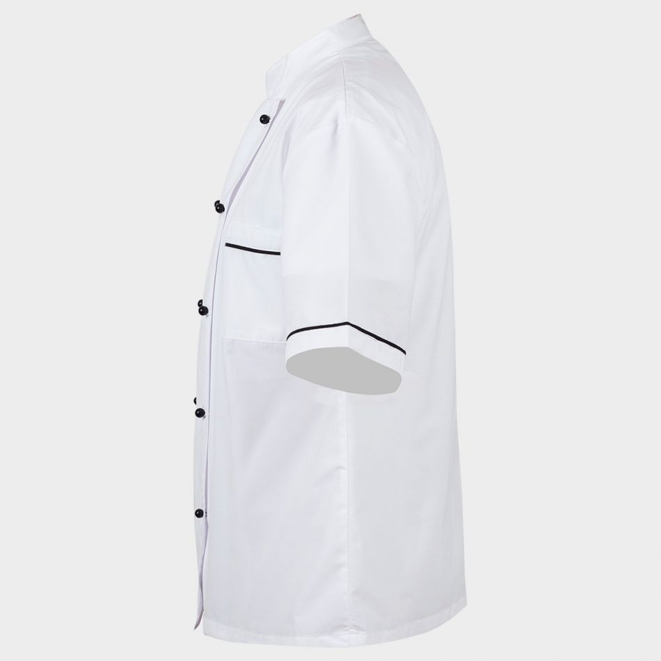 Моделът е с къс ръкав, което осигурява свобода на движение и допълнителен комфорт при работа в горещи условия. Нагръдният джоб е практично допълнение, позволяващо съхранение на малки аксесоари като химикал, бележки или термометър, винаги под ръка. Подвижните копчета улесняват обличането и събличането, като същевременно придават завършен и професионален вид на туниката.