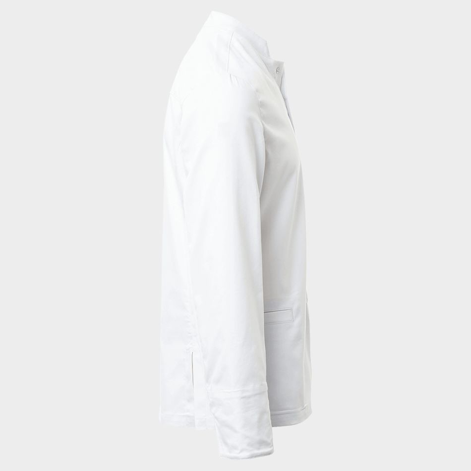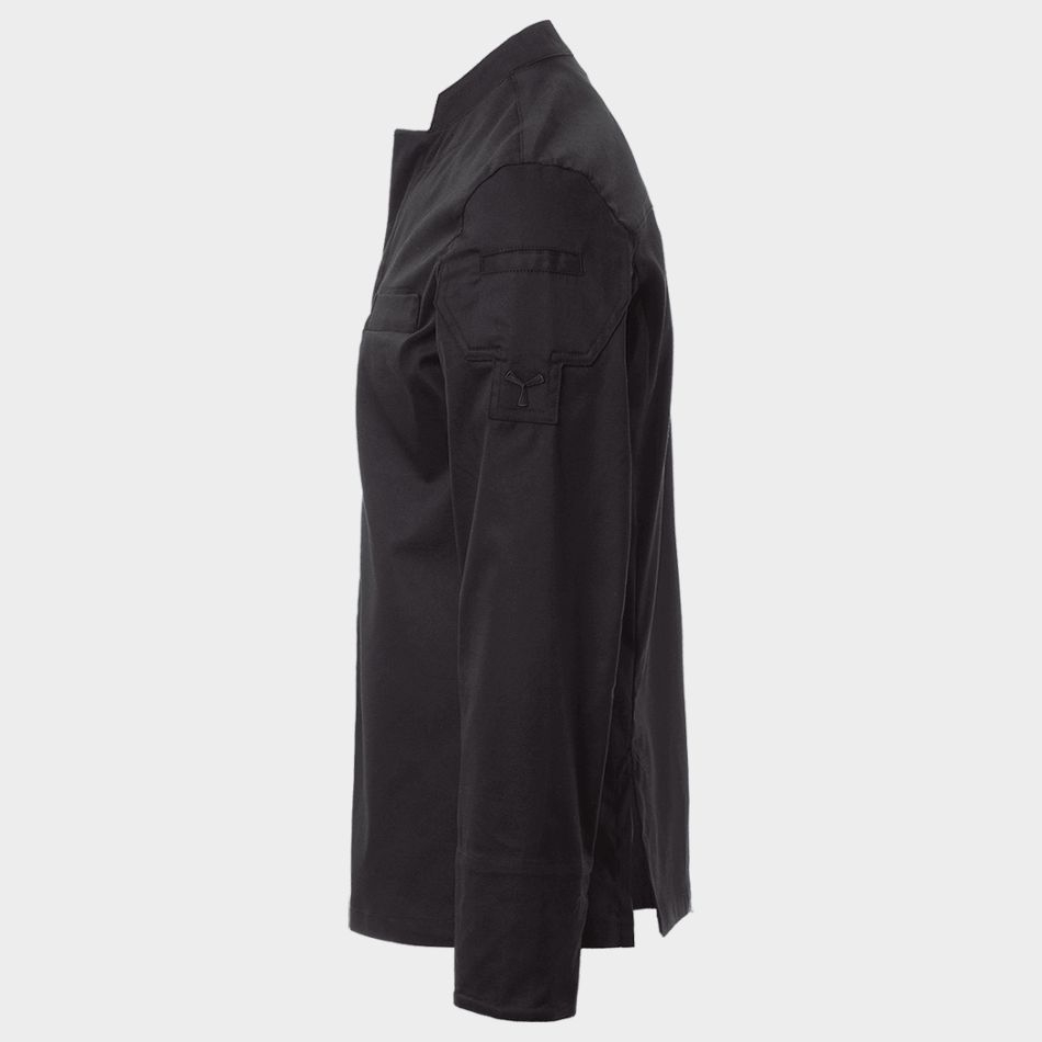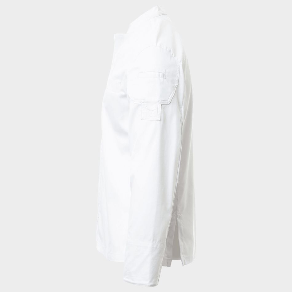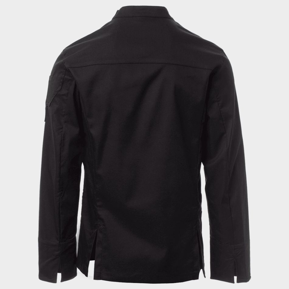 Моделът разполага с яка тип „столче“, която придава изчистен и професионален вид. Закопчаването с тик-так копчета е практично и удобно, а дългите ръкави с маншети могат лесно да се навиват, според предпочитанията и условията в кухнята. Мрежестата материя под мишниците допринася за допълнителна вентилация и комфорт при високи температури.