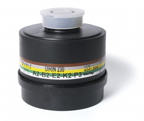 Газовите филтри DIRIN 230 A2-B2-E2-K2-P3 R съдържат гранулиран активен въглен, който отстранява химически и/или физически токсични газове и пари. Комбинираните филтри са изработени от елемент с активен въглен и от филтър за твърди частици, като последният е изработен от нагънат лист от стъклени влакна клас P3, поддържан заедно от формован синтетичен материал. Във филтрите от серията DIRIN гъвкавата патентована диафрагма поддържа въглен компактен, като компенсира всяка промяна в обема във времето. Компактните филтри осигуряват защита далеч над минималните нормални изисквания. Всички останали характеристики остават непроменени. СЕРИЯ DIRIN 230 • Включва филтри изработени от удароустойчива пластмаса.