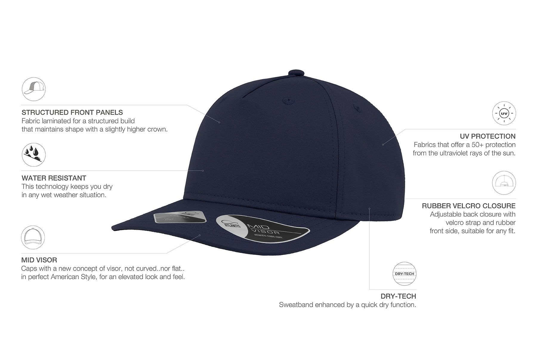Шапка с козирка на италианския производител Atlantis. Шапката е изработена от дишащ микрофибър с покритие за UV защита UPF50+. От вътрешната страна шапката е с противоизпотяващи ленти DRY TECH. Тази шапката позволява коригиране на размера чрез специална система с велкро и е отличен аксесоар за дейности на открито понеже съчетава в себе си водоустойчивост, дишащи качества и UV защита UPF50+ Предлага се в различни цветове.